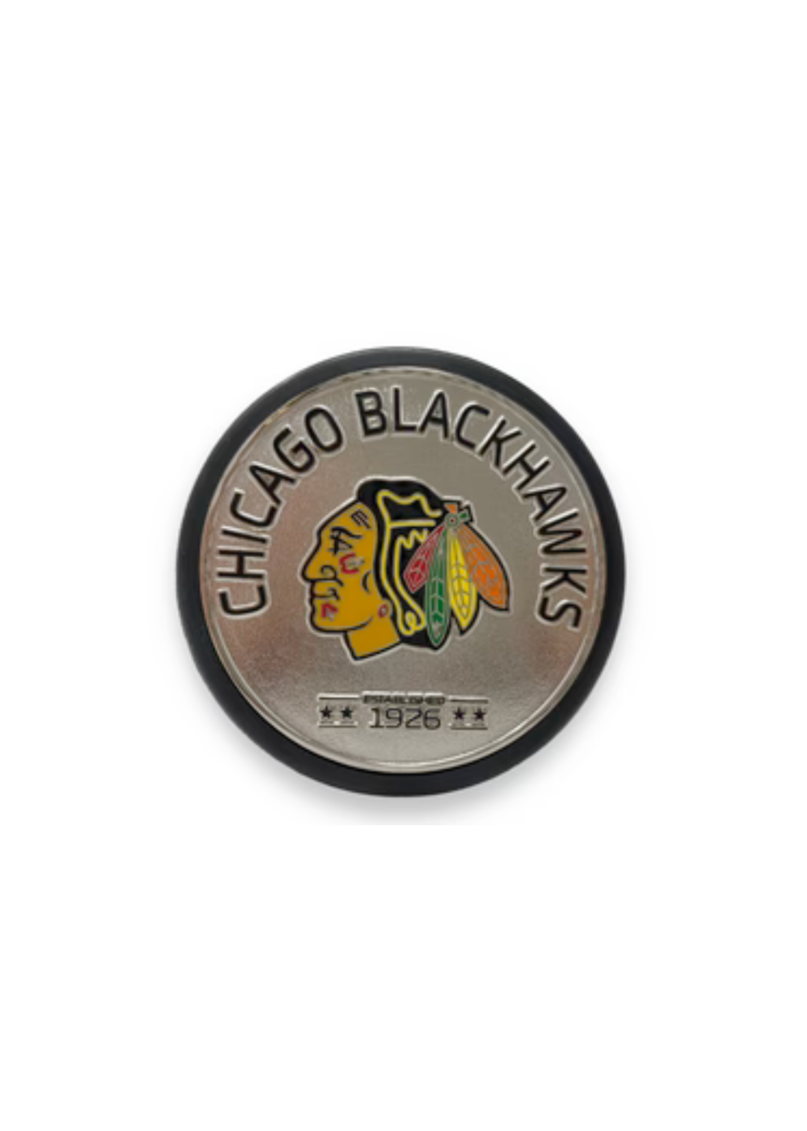 Finished with a shiny silver plating that adds richness and vibrancy to a classic medallion style. These works of art boast an eye-catching gleam unmatched in the collectible puck market. The beautiful metal work is contrasted with a hand-painted, cloisonné color-fill and silver floor. Medallions are cast from zincy-alloy.
